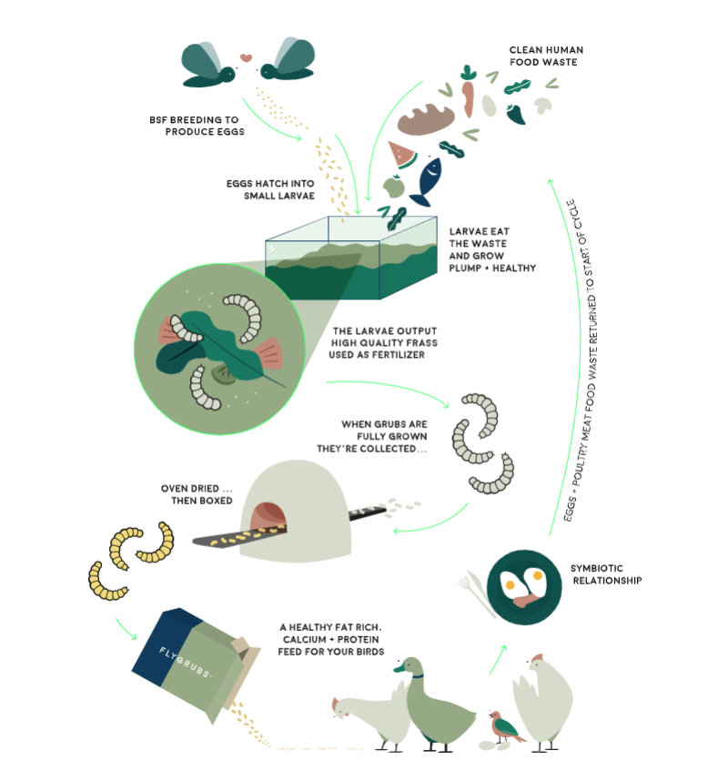 We’re turning food waste destined for landfills into hen treats. Food waste in landfills produces methane that negatively affects the climate (about) 20x worse than carbon dioxide. Studies show as low as 3% of food waste is recycled worldwide! Our grub worms are a renewable feed additive, raised on traceable food and organic waste.